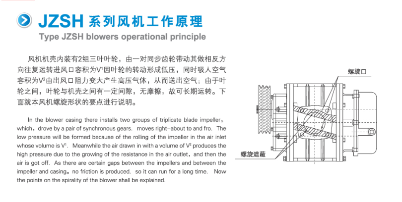 一.螺旋形狀是20°以上的固定螺旋方式。機殼的進排風屏蔽線切入螺旋,以轉子頂端光面線構成的三角形進排風口,通過轉子的旋轉而循序打開。本風機的進排風口,不像舊式羅茨螺旋風機那樣在瞬間打開或關閉,所以運轉聲音極小,幾乎沒有排風脈動。