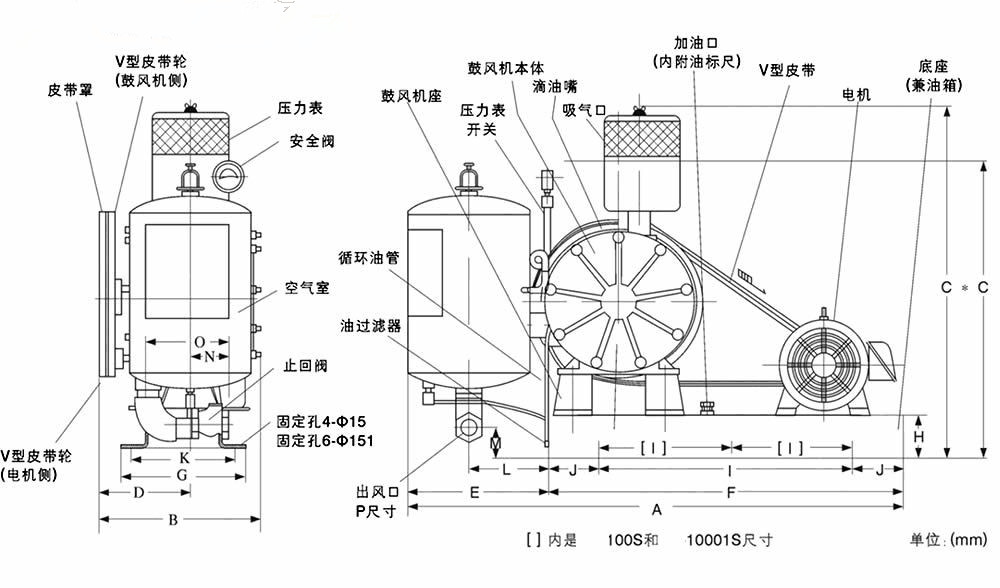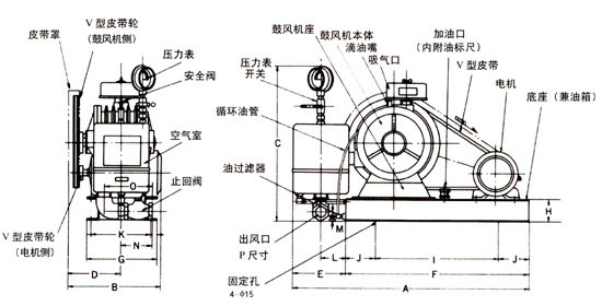 回轉式風機主要有電機、空氣過濾器、鼓風機本體、空氣室、底座(兼油箱)、滴油嘴六大部件。