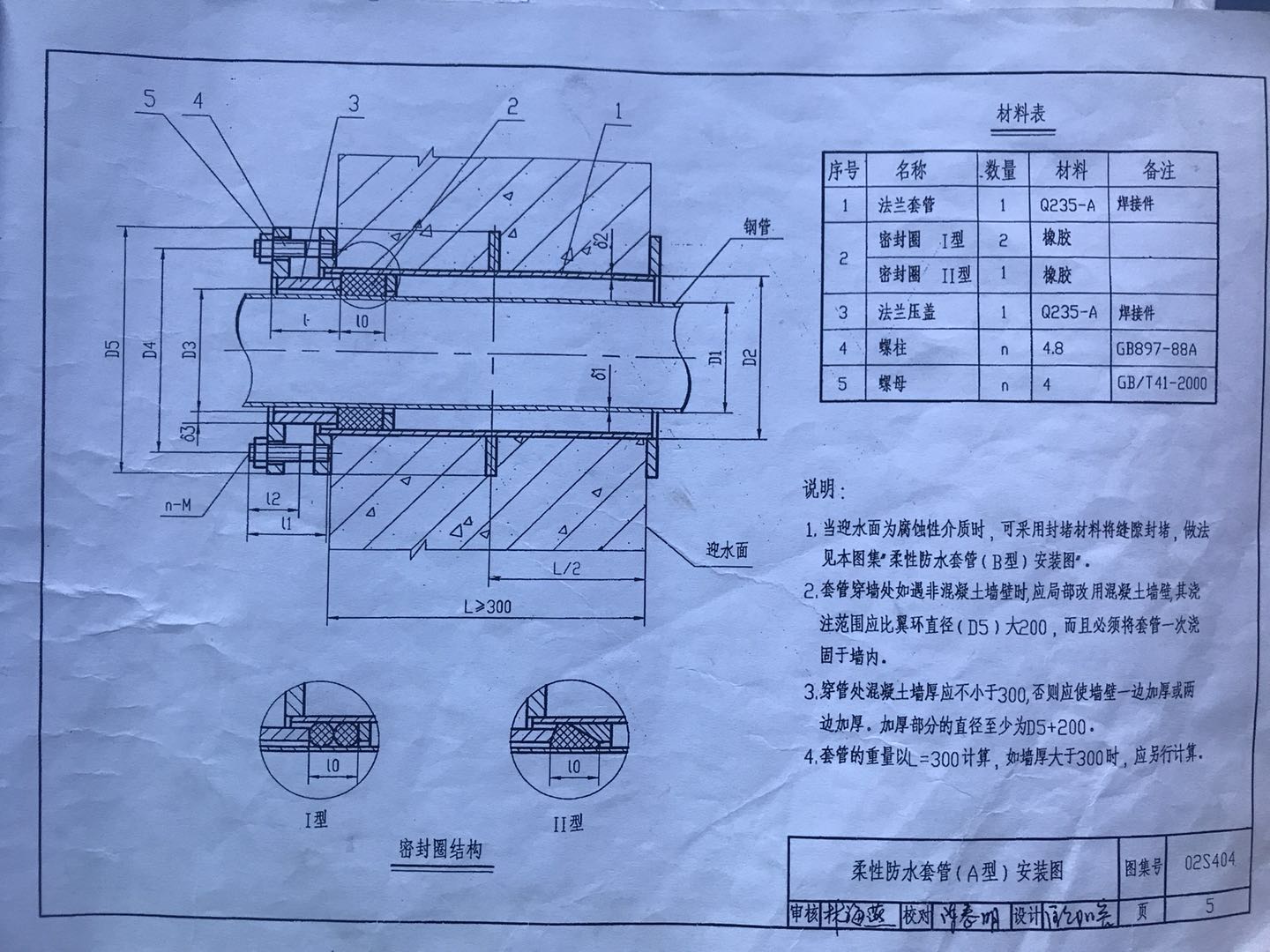 1、當迎水面為腐蝕性介質時,可采用封堵材料將縫隙封堵,做法見防水套管圖集;柔性防水套管(A型)安裝圖。